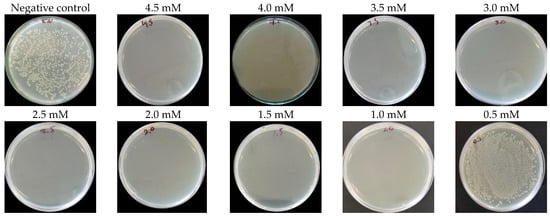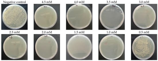 The minimum bactericidal concentration (MBC) of AgNPs against the E. coli was 4.5 mM (0.49 mg/mL) (Figure 9). In contrast, against the S. aureus strain, AgNPs showed an MBC of 4.0 mM (0.43 mg/mL), as depicted in Figure 10. Additionally, minimum inhibitory concentrations were determined, with both strains exhibiting concentrations of 0.5 mM (0.05 mg/mL), as detailed in Table 1.