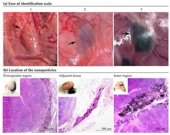- Ease of identification. Before dissection surgery, the tattooed lymph nodes were evaluated in situ and the “ease of visual identification” was subjectively assessed by experienced surgeons on a scale from 1 to 3 (1 being ‘indistinguishable’ and 3 “optimal”), as depicted in Figure 2a.