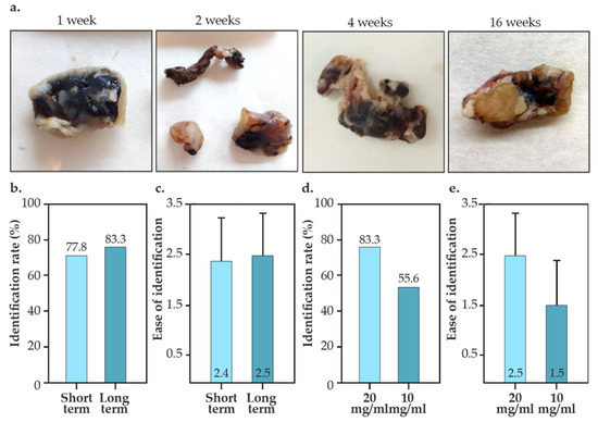 Identification rate and ease of identification of Mel-NPs tattooed lymph nodes. (a) Photographs of lymph nodes tattooed with Mel-NPs vectors (20 mg/mL) at different times. (b) Identification rates of lymph nodes tattooed with Mel-NPs vectors (20 mg/mL) in the short- and long-term studies. (c) Ease of identification of lymph nodes tattooed with Mel-NPs vectors (20 mg/mL) in the short and long-term studies. (d) Identification rates of lymph nodes tattooed with Mel-NPs vectors using 20 and 10 mg/mL colloids in the long-term studies. (e) Ease of identification of lymph nodes tattooed with Mel-NPs vectors using 20 and 10 mg/mL colloids in the long-term studies.