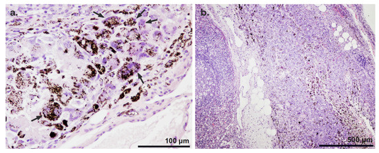 In all tattooed lymph nodes, granulomatous foreign-body-reaction-type inflammation associated with the presence of Mel-NPs was identified. The inflammatory process was characterized by the presence of macrophages and multinucleated giant cells that phagocytosed and isolated the Mel-NPs from the first week after inoculation (Figure 6a). Necrotic foci associated with the foreign-body-type inflammatory reaction to the administration of the particles were observed in some lymph nodes (Figure 6b).