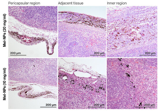 Location of Mel-NPs (10 and 20 mg/mL) in the adjacent tissue, the pericapsular region, and the inner lymph node region.