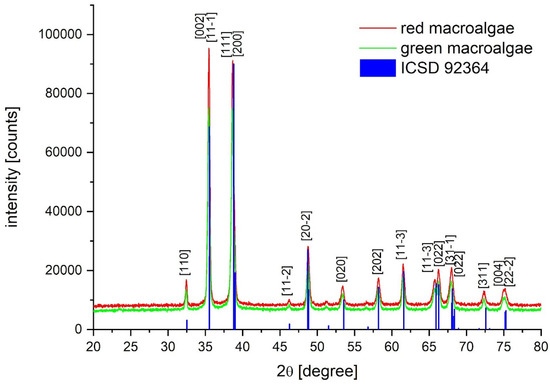 X-ray Powder Diffraction (PXRD) analysis resulted in equal diffractograms for the nanoparticles from the two types of algae. According to the Inorganic Crystal Structure Database (ICSD, card no. 92364), the NPs are composed of tenorite, and the dimensions could be estimated within the range of 30–40 nm for both nanoparticles deriving from red and green algae (Figure 1). The XRD diffractometry of CuO nanoparticles from Halymenia dilatata seaweed aqueous extract is slightly different, probably due to a capping agent formed during the nanoparticle synthesis [45].