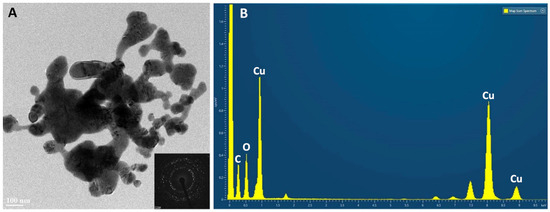 Nanoparticles from G. verrucosa. (A) TEM, with the diffraction pattern as inset. (B) EDX spectrum.