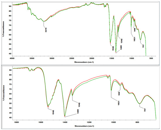 The two spectra are perfectly superimposable (Figure 5); the organic residues derived from the two different algae have the same composition. The FTIR spectra are insufficient to identify the organic components. However, we can hypothesize the presence of some particular functional groups, based on their known IR absorption [47,48]. The broad peak in the region 3500–3000 cm−1 can be seen as the result of multiple absorptions, such as those due to OH, NH, and CH stretching; the peak at 1542 cm−1 could suggest the presence of aromatic rings (abundant, for example, in polyphenols), as it may be attributed to the aromatic ring stretch; the peak at 1405 cm−1 could be due to the bending of OH bonds; the peak at 787 cm−1 could be a further absorption of the aromatic rings.