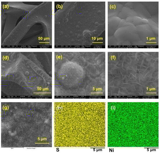 The scanning electron microscope (SEM) images in Figure 2a–f show the surface morphology of bare NF (Figure 2a–c) and Ni3S2@Ni (Figure 2d–f). We can see that, compared with the smooth surface of the bare NF, the Ni3S2@Ni electrode surface was covered with sheet-like nanoparticles, which were thought to be Ni3S2. In order to confirm that the nanosheet particles are nickel sulfide, the energy spectrum analysis was performed on the area where the nanosheet was produced. As shown in Figure 2h,i, it was found that both the Ni element and S element were evenly distributed on the surface. The sulfurized surface of Ni3S2@Ni was confirmed immediately via energy-dispersive X-ray spectrometer mapping, which entails the successful preparation of Ni3S2 on the surface of Ni3S2@Ni electrode. In addition, the content of different elements in mapping spectra is displayed in Table 1. It can be found that in addition to the formation of nickel sulfide, a part of nickel oxide is also produced on the surface of NF.