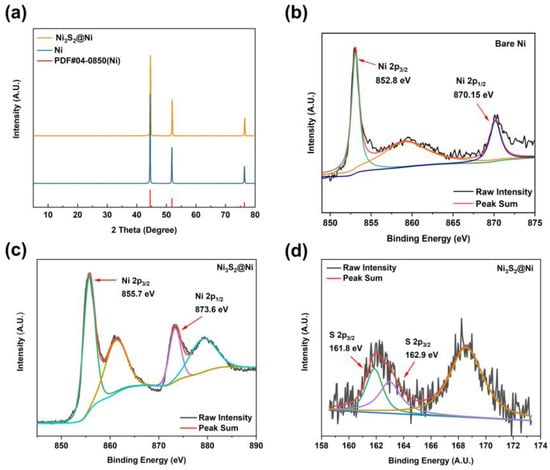 To further characterize the successful preparation of Ni3S2@Ni, XRD was carried out to obtain their crystal structure information (Figure 3a). By comparing the diffraction peaks of Ni and Ni3S2@Ni with the standard PDF data, three distinct diffraction peaks can be observed. They are, respectively, located at 44.21° (111), 51.51° (200), and 75.84° (220). However, the XRD pattern of the Ni3S2@Ni electrode only has obvious characteristic peaks of Ni. The peaks of Ni3S2 are not obvious in the spectrogram, which means the loading of Ni3S2 on the surface of NF is controlled at a very low level and the modification reaction occurs solely on the ultrathin surface of NF without damaging the substrate. In order to confirm that the modifier is Ni3S2, XPS was used consequently, and the results are shown in Figure 3b–d. In the Ni 2p spectrum, two main peaks at 855.7 eV and 873.6 eV can be assigned to Ni 2p 3/2 and Ni 2p 1/2, respectively. The binding energy of metallic Ni is 852.8 eV (2p 3/2) and 870.15 eV (2p 1/2). As Ni3S2 was successfully synthesized, the electron cloud density near the Ni element decreased due to the formation of ionic bonds, resulting in a weakened shielding effect. Therefore, valence electrons around the Ni element obtained a higher binding energy of 855.7 eV (2p 3/2) and 873.6 eV (2p 1/2). And, in the S 2p spectrum, peaks at 161.8 eV and 162.9 eV can be assigned to S 2p 3/2. The binding energy of S 2p 3/2 in Ni3S2 is reported to be 163.0 eV, which is consistent with our XPS results. As for the peak at 161.8 eV, this may be ascribed to the formation of NiS (162.1 eV). In a word, the spectra of Ni 2p and S 2p prove that the modifier on NF is Ni3S2.