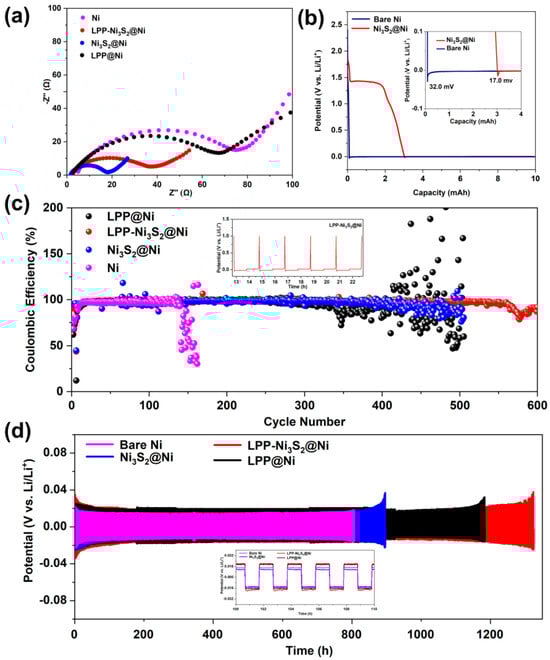 (a) EIS for half-cells of Ni|Li, LPP@Ni|Li, Ni3S2@Ni|Li, and LPP-Ni3S2@Ni|Li. (b) Nucleation overpotential of bare Ni and Ni3S2@Ni. (c) Coulombic efficiency of half-cells assembled with bare Ni, LPP@Ni, Ni3S2@Ni, and LPP-Ni3S2@Ni. (d) Voltage-time profiles of Ni-Li|Li, LPP@Ni-Li|Li, Ni3S2@Ni-Li|Li, and LPP-Ni3S2@Ni-Li|Li symmetric cells.