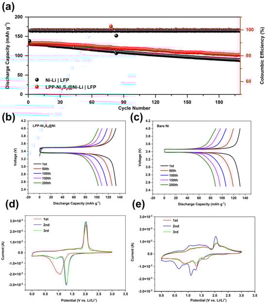For full cells, 3 mAh cm−2 of lithium was first deposited on LPP-Ni3S2@Ni current collector to fabricate LPP-Ni3S2@Ni-Li a composite lithium metal anode, and an electrode with LiFePO4 (1.7 mg cm−2) was employed as a cathode. Meanwhile, the bare NF was treated in the same way as LPP-Ni3S2@Ni and tested as the reference group. The cycle stability performance of the full cell is shown in Figure 6a–c. The cycle performance of the LPP-Ni3S2@Ni-Li composite anode is better than that of bare Ni-Li. This is because the lithiophilic structure of LPP-Ni3S2@Ni can guide Li+ to nucleate and deposit uniformly on the surface; meanwhile, the LPP with a crosslinked structure can further help regulate the Li+ flux and the deposition of lithium. Furthermore, the reversibility and lithium plating/stripping stability are also improved via the lithiophilic LPP layer, which is manifested through Cyclic Voltammetry Curves in Figure 6d,e. Furthermore, the three-dimensional NF can decrease the local current density and help uniformly disperse electron distribution, thereby further promoting the uniformity of the lithium deposition process and improving battery performance. The Coulombic efficiency of bare Ni-Li|LFP cells is lower than that of LPP-Ni3S2@Ni-Li|LFP cells and was maintained at 99.20% and 99.60%, respectively. For capacity, LPP-Ni3S2@Ni-Li|LFP shows higher initial specific capacity (133.5 mAh g−1) than Ni-Li|LFP (131.2 mAh g−1), and the capacity remains 76.78% and 67.53%, respectively, after 200 cycles. The details of the charge and discharge curves of LPP-Ni3S2@Ni-Li|LFP batteries and bare NF-Li|LFP batteries are shown in Figure 6b,c. We can find that the cell modified with the lithiophilic architecture has greater polarization but its capacity retention rate is higher.