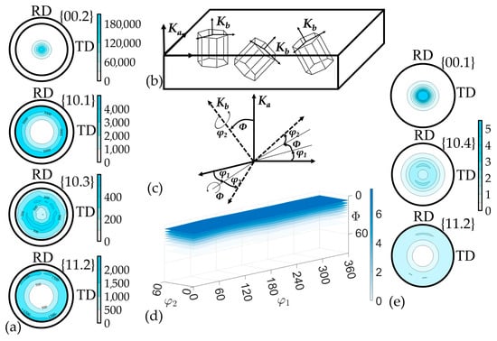 The complete texture description of the material can be obtained through the calculation of the orientation distribution function (ODF) of nanocrystallites (Equation (9)) [48] using MTEX (ver. 5.11.2) free software. This model contains comprehensive information about all orientations of nanocrystallites within the sample volume under study. The ODF allows for the calculation of any property of the material from the properties of individual crystallites. The ODF (f(g)) shows how the crystallites in the polycrystalline are distributed over the crystallographic orientations g described by Euler angles (φ1, Φ, φ2) (Figure 2c). These angles reflect the relation between the coordinate system related to the study sample and the system, which is related to the crystallographic orientation of the grains in the material (Figure 2b).