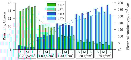 Specific electrical conductivity σ is the inverse dependence on specific resistance (Equation (13)). Consequently, as the density increased from 0.70 to 1.75 g/cm3 in the GFs of all S, M, and L series, there was an increase in σ from 69 kS/m to 187 kS/m in the RD (Figure 5, blue bars) and from 67 kS/m to 169 kS/m in the TD (Figure 5, light blue bars). This parameter is described by the linear dependence. The equations and determination coefficients for σ are presented in (17) and (18) (dotted blue lines):