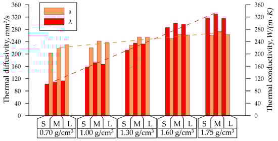 This parameter was more suitable for assessing the thermal properties of the material, since the thermal conductivity was dependent not only on the structural characteristics of the graphite crystal lattice, but also on its mesoparameters (the density and the specific heat). This was evident from the minimal differences of thermal conductivity coefficients among the S, M, and L series at the fixed density.