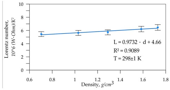 The Lorenz number directly characterizes the material’s state. This parameter depends on the structural parameters of the crystallites and should not vary with the material’s porosity. However, data analysis revealed a slight trend of an increasing proportionality constant with increasing density of graphite foils. This suggests that nanocrystallites undergo structural changes that affect this parameter.