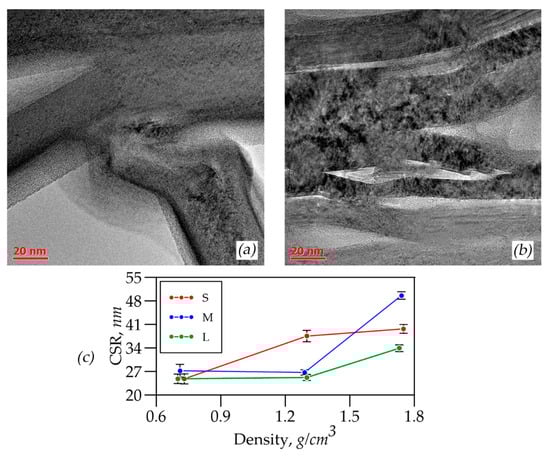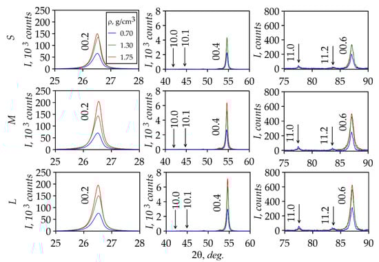 The misorientation angles (MA) of nanocrystallites were determined by X-ray [46]. For this, rocking curves were recorded to (00.6) to reflect XRD patterns of hexagonal graphite on the Rigaku Ultima IV diffractometer. X-ray tube radiation was CuKα = 0.15426 nm and Bragg–Brentano focusing was used. The recording was carried out in the diffractometer θ mode at a fixed value of 2θ (00.6) reflection XRD patterns for GFs of the S, M, and L series with densities of 0.70, 1.30, and 1.75 when scanning at θ from 10° to 80°. Then, the FWHM of the resulting rocking curves was calculated using PDXL2 software, which was taken as the MA value.