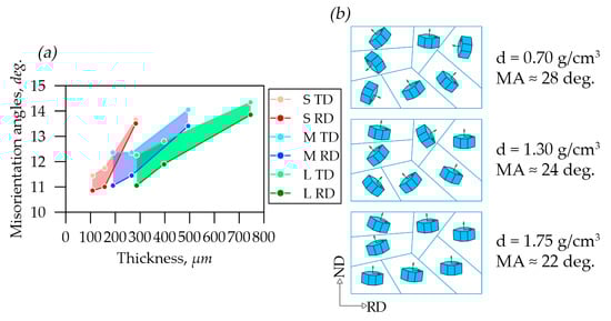 This coefficient was increased according to the power law by these density growths. It can be assumed that the linearity of the anisotropy coefficient with the density increase in the foils becomes more apparent. The property tended to grow more significantly along the RD due to the nanocrystallites’ preferred orientation during cold rolling. Figure 16a,b also show that the anisotropy coefficient decreased with the decline in the samples’ thickness. It was associated with the reduction in the graphite mesoparticles’ reorientation. This result also correlated with the anisotropy coefficient distribution of the misorientation angles, shown in Figure 16c. It followed from the data set that the properties’ values were influenced by the aggregate meso- and nanostructural factors.