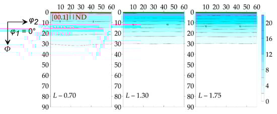 According to the obtained complete DPFs, it was seen that all samples have the preferred orientation of the (00.1) basal plane normal lines perpendicular to the foils’ rolling planes. The most pronounced texture was observed in the L-1.75 sample, which was seen from the increase in the pole density of the (00.1) maximum.