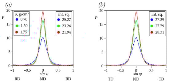 When analyzing the foils’ texture data, it was also possible to note the slight asymmetry of the texture maximum at the complete DPF {00.2} for density 1.75 g/cm3. With the density increase in the TD-ND-TD section of the pole figure, it has the larger integral sum of pole densities compared to RD-ND-RD (Figure 15a,b).