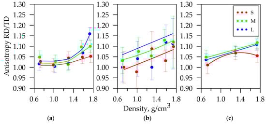 The anisotropy study of physical and mechanical properties was conducted on the S, M, and L series GF samples with densities from 0.7 to 1.75 g/cm3. The anisotropy of mechanical properties have been previously described in [42]. The anisotropy coefficient dependence of the tensile strength of GFs with different thicknesses on their density is shown in Figure 16a.