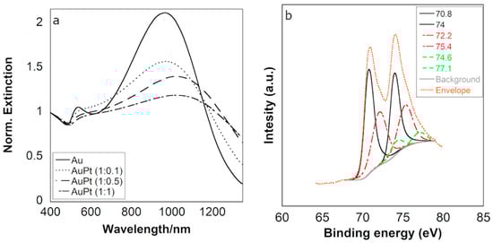 (a) Normalized extinction spectra of Au and AuPt NPs obtained with different Au:Pt molar ratios. (b) XPS spectra of AuPt NPs.