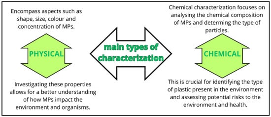 When discussing the detection of MPs and NPs, it is essential to acknowledge a series of steps and precautionary measures that must be taken into account for a comprehensive analysis. This process extends from the sampling and processing of samples to detection and identification. Although new methodologies are continuously evolving, the analysis of MPs and NPs typically involves two main types of characterizations, e.g., physical and chemical methods (Figure 2).