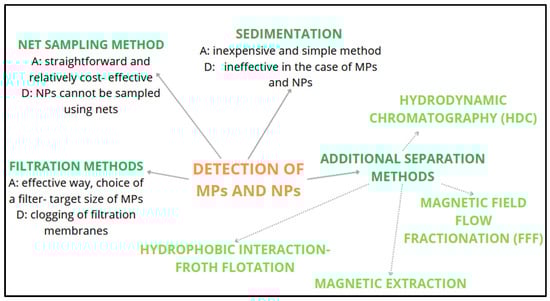 Presentation of various methods for the detection of MPs and NPs, pointing out their main advantages (A) and disadvantages (D). Some of them are already well researched, while others are just being developed.