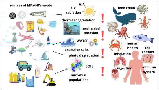 The presence of MPs and NPs in various ecosystems, including in water, air, and on land, has garnered significant attention from the scientific community. Their persistent existence can lead to serious detrimental impacts on the environment and human health, both directly and indirectly [12,75].