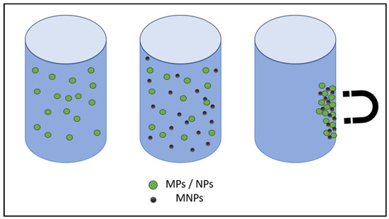 Currently, the most promising technique for removing NPs from wastewater and drinking water involves the use of various nanomaterials such as chitosan, metallic, polymeric, zeolitic, bimetallic, carbonate, magnetic, ferritic, and metallic oxides [3]. The magnetic separation of nanoparticles is faster than centrifugation and filtration. MNPs are suitable for use because, in addition to typical nanomaterial properties such as a small particle size and large specific surface area, they also exhibit superparamagnetic characteristics, making them suitable for various analytical applications [131]. In Figure 8, a schematic diagram of removing NPs/MPs from wastewater by MNPs is shown.