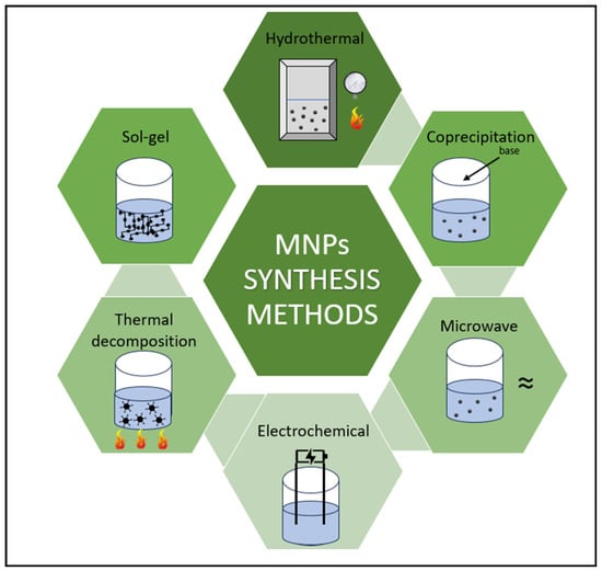 Various methods are available for the synthesis of MNPs (Figure 9), each of which has its own advantages and special features [145]. There are several factors to consider when synthesizing MNPs, such as particle size and shape, chemical purity, particle stabilization, property tailoring, etc. The synthesis methods can influence the size, shape, and distribution of the particles, which, in turn, affect their final properties [134]. To achieve the desired magnetic properties, pure synthesis is crucial. Since the particles tend to aggregate, the stabilization of the particles by a layer of organic or inorganic materials is essential. By changing the composition or by introducing surface coatings (e.g., polymers, biological molecules), the properties of nanoparticles can be adapted to the respective applications [133,140,145].