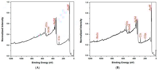 XPS was used as an additional method to confirm that Cl− adsorption occurs to the PC30,10 (see Figure 2 below). Before exposure to 2 M NaCl, the most abundant signals in the XPS survey spectrum were from Au, Ag, Sn, C, and O. The surface atom percentages are shown in Table 1. The carbon signal comes from contamination and is typically observed, at high surface percentages, in XPS spectra of metals that have been exposed to air [,]. Because of this contamination, only about 30% of the surface was bare gold (Table 1). The Sn and Ag are byproducts of the electroless plating process [] and are only seen in ultrathin films, such as the 10 nm films plated here. High resolution XPS data show that Ag was present as a metal and Sn was present as SnO2, not as a metal (see Supplementary Materials).