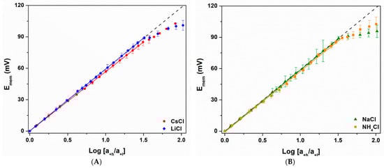 Nernst plots for the PC30,10 in a concentration cell containing (A) CsCl (red) and LiCl (blue), and (B) NaCl (green) and NH4Cl (orange). The dashed lines correspond to ideal cation permselectivity (Equation (1)). Standard deviations were determined from three replicate measurements.