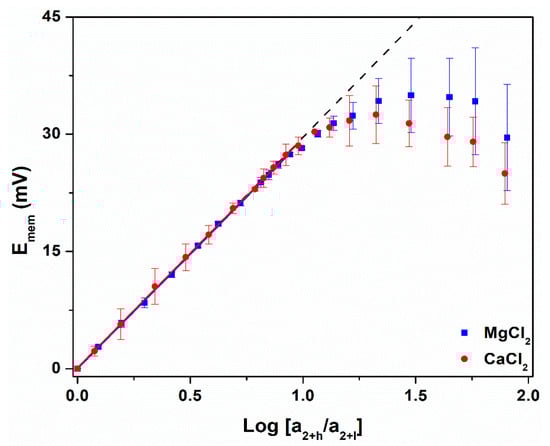 Nernst plots for the PC30,10 in a concentration cell containing MgCl2 (blue) and CaCl2 (red). The dashed line corresponds to ideal cation permselectivity (Equation (1)). Standard deviations were determined from three replicate measurements.