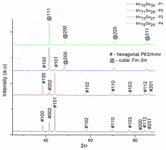 The situation is, however, completely different for the P3 and P4 samples, with Mn content of 73 to 75 at%. It can be seen that in the diffractogram of the P3 sample, the Bragg lines of the D019 Mn3Ga are mostly disappearing, giving rise to a different peak structure. Only (100) and (101) hkl reflections of the hexagonal phase are visible with a much-reduced intensity. The main observed diffraction lines belong to the cubic Mn3Ga phase, as it can be seen in the indexation in Figure 1. In the diffractogram of sample P3, it can be seen, however, that there is still reminiscence of the main Bragg peak of the D019 Mn3Ga, the (101) reflection. It is concluded thus that within this narrow range of composition, 70 to 75 at% Mn, there could be a completely different structure formed for the binary alloys. We show that, for a Mn content from 70 to 71 at%, the compound crystallizes in the D019 Mn3Ga hexagonal structure, while from 73 to 75 at% it crystallizes in the cubic Mn3Ga phase structure. The finding is consistent with recent analysis of [35] where it was shown that in Mn3Ga with composition close to 75:25 Mn to Ga, there occur a shear-induced, temperature-prompted, back-and-forth transformation between the cubic and hexagonal structures. Moreover, when annealing at 400 °C, two different transformation pathways are identified [36], both terminating in tetragonal Mn3Ga as the equilibrium phase. This cited study though [36] does not investigate various compositions, around the 75:25 point, as in our report; therefore, their findings regarding the final structure obtained after annealing are only valid for a binary alloy composition at the 75:25 point in the MnGa phase diagram.