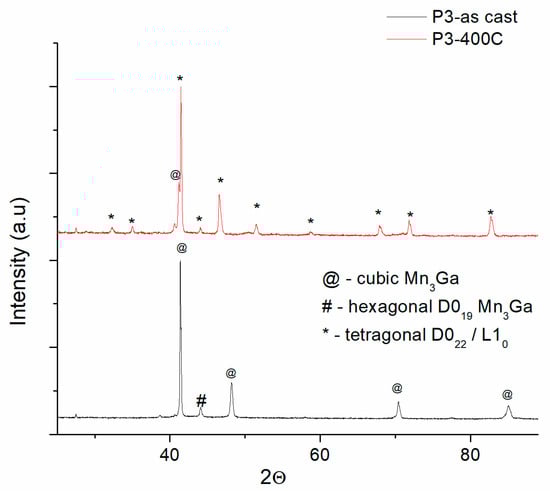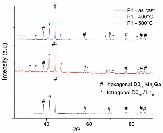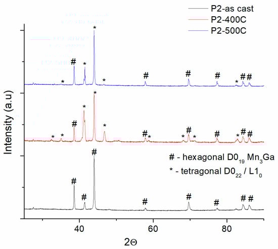 Figure 2 shows the XRD data of as-cast and annealed P1 samples. The annealed samples have quite different image compared to the as-cast sample. While in the as-cast state, the diffraction lines marked with # are indexed as belonging to the D019 hexagonal Mn3Ga phase, making the as-cast state a single-phase structure, the annealed samples show, besides the peaks of the D019 hexagonal phase, occurrence of additional Bragg peaks, marked with *, diffraction lines that were indexed as belonging to the tetragonal phases D022/L10 MnGa. Almost similar features are encountered in the case of the P2 samples (Figure 3). Here, for the P2 samples annealed at 400 °C and 500 °C, the occurrence of the tetragonal D022/L10 phase accompanying the co-existing hexagonal D019 Mn3Ga phase, is observable in a larger amount than in the case of the P1 sample annealed at 400 °C, as revealed by the higher peak intensities of the correspondent Bragg lines.