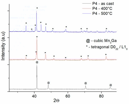The situation is quite similar also in the case of the P4 samples, as-cast and annealed (Figure 6). Here, the as-cast state consists of a cubic Mn3Ga phase, as it can be seen that only the Bragg reflections of the cubic Mn3Ga phase, space group Fm-3m (ICDD PDF file: 04-001-3054) were identified by MAUD fitting. Upon annealing though, the cubic structure is not seen anymore, with the annealing at 400 °C and 500 °C causing the almost complete structural phase transformation from cubic to tetragonal D022/L10 phases. For both annealed P4 samples, the temperature of annealing is sufficient to transform almost completely the cubic phase into the tetragonal phases, with visible consequences also in the magnetic performances of the alloys, to be explained hereafter.