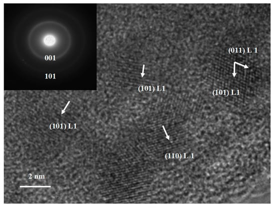 Structural analysis by XRD has been complemented by TEM and EDP determinations. While the phase evolution from the as-cast state towards obtaining magnetically relevant tetragonal phases was thoroughly investigated in the previous section, we have employed TEM imaging characterization combined with EDP only on selected samples. For that purpose, we have chosen to investigate the P4 annealed samples where it was found by full-profile analysis that tetragonal phases are co-existing in the microstructure upon annealing and their abundance is the largest, among all other investigated samples. For the P4 sample annealed at 400 °C, we have obtained and present here (Figure 7) the electron diffraction pattern, as a map of the diffraction pattern in the reciprocal space. Here, we can see that there are bright spots organized in rings which corresponds to hkl reflections in the direct space. By measuring the distances from the center of the image to the bright spots, we have been able to calculate the reticular distances and we could assign unambiguously the coherent rings to both the (001) and (110) superlattice peaks which belong to the tetragonal L10 Mn2Ga phase. Figure 8 depicts an example of a high-resolution TEM image of the P4 sample annealed at 500 °C, as well as its selected area electron diffraction pattern, as inset. Here, we can see that the samples exhibit a nanogranular microstructure, with nanometric-sized regions. Nanometric-sized small crystals are observed and imaged in high resolution. These small, observed nanocrystals have 3 to 6 nanometers, in average size, and are dispersed into a residual matrix of a different nature, as revealed by the difference in contrast as well as in the crystallinity of the surrounding region. The observation allowed us to detect and image neatly the parallel atomic planes where we could measure the d-spacings between these planes.