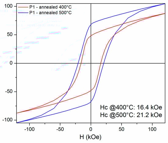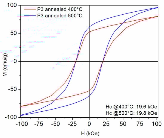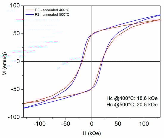 In the case of the P2 samples, also annealed at 400 °C and 500 °C, the behavior is quite similar, but in this case, there is not much difference in terms of saturation magnetization and coercivity between the two different annealing temperatures. Here, the coercivity amounts to 18.6 and 20.5 kOe, respectively, for the two annealing temperatures. Saturation magnetization reaches 75 emu/g (0.5 M A/m) and 88 emu/g (0.59 M A/m).