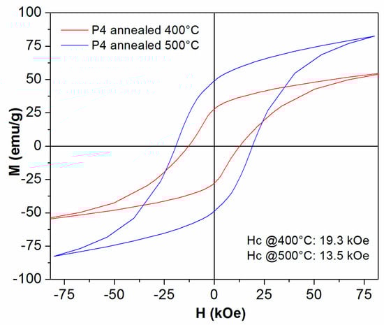 In the case of the P4 samples, the situation is rather different, since here, the differentiation between the annealing at 400 °C and 500 °C is more pronounced. In this case, the sample annealed at 400 °C has 13.5 kOe coercivity and 55 emu/g (0.37 M A/m) saturation magnetization. The annealing at 500 °C produces a significant increase in both parameters. It means that here, the coercive field is much larger (19.3 kOe) and specific magnetization is also increased up to 83 emu/g (0.55 M A/m). These very large values of coercivity and magnetization are consistent throughout the whole series of samples and are encouraging in view of potential applications as permanent magnets and will be discussed in the following section.