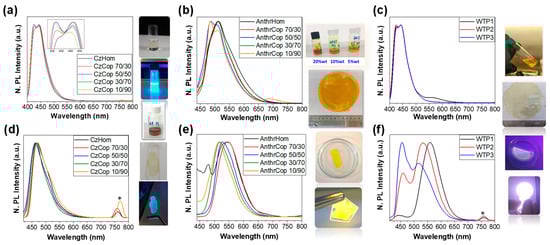 Photoluminescence (PL) spectra normalized at the emission maxima of (a) carbazole (Cz)-based polymers in DMF solution (exc. 380 nm). The insets show an enlarged view of the peak maxima of the curves.; (b) anthracene (Anthr)-based polymers in DMF solution (exc. 420 nm); (c) white light terpolymers (WTPs) in DMF solution (exc. 380 nm); (d) carbazole (Cz)-based polymers in film form (exc. 380 nm); (e) Anthr-based polymers in film form (exc. 420 nm).; (f) white light terpolymers (WTPs) in film form (exc. 380 nm). The peaks denoted with an asterisk in (d,f) at ~760 nm are due to the laser excitation wavelength (760 nm = 2 × 380 nm). The photographs next to (a,d) show a CzCop 70/30 solution and a thin film under ambient and UV light (at 365 nm), and a 10%wt of the copolymer at r.t. in DMF. The photographs next to (b,e) show AnthrCop 70/30 in DMF solutions at r.t. of 20, 10, and 5%wt concentrations, a 40 um thick and 9 cm wide free-standing film of the AnthrCop 70/30, and a thin film deposited on quartz substrate via drop casting of AnthrCop 30/70 under UV light (at 365 nm). The photographs next to (c,f) show a DMF solution of WTP2 at r.t., a 20 um thick and 15 cm wide free-standing film of WTP2, a thin film deposited on quartz substrate via drop casting of WTP2, and a round flask covered inside with a thin film of WTP3 under UV light (at 365 nm).