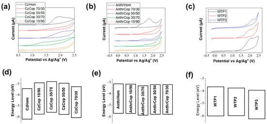 To determine the HOMO and LUMO levels of the luminescent polymers, cyclic voltammograms were recorded for thin films deposited onto an FTO substrate. The oxidation potentials of all copolymers are presented in Figure 2. The HOMO level, which was irreversible in all cases, was determined from the onset of the oxidative wave using Equation (1). However, no clear determination of the LUMO level was possible via CV, and therefore, this was only by approximation determined from the absorption of the corresponding thin film using Equations (2) and (3). As is evident from Figure 2, the HOMO levels of the blue-emitting polymers are between −6.21 and −5.73 eV. The CzHom and CzCop 70/30 have HOMO levels at −6.21 eV and −6.07 eV, respectively. When the Cz moiety was incorporated in 10, 30, and 50 mol% in the polymeric chain, not much difference was seen in the HOMO levels. The LUMO levels for the polymers follow a similar trend, with CzCop 10/90, 30/70, and 50/50 having similar levels, while higher loadings of Cz, such as 70 and 100 mol%, have deeper and similar LUMO levels. In the case of the yellow-emitting polymers, they all exhibit similar energy levels, regardless of the chromophore loading on the polymeric chain. The HOMO levels for all Anthr-based polymers are between −5.86 eV (for AnthrCop 30/70) and, at the most, −5.7 eV (for AnthrHom). The LUMO levels are between −3.14 eV for AnthrHom and −3.31 eV for AnthrCops. Finally, for the white-emitting copolymers, WTP1 and WTP2 have similar energy levels, while WTP3 displayed deeper HOMO and LUMO levels. The detailed electrochemical data for all polymers that have been studied can be found in Table S4.