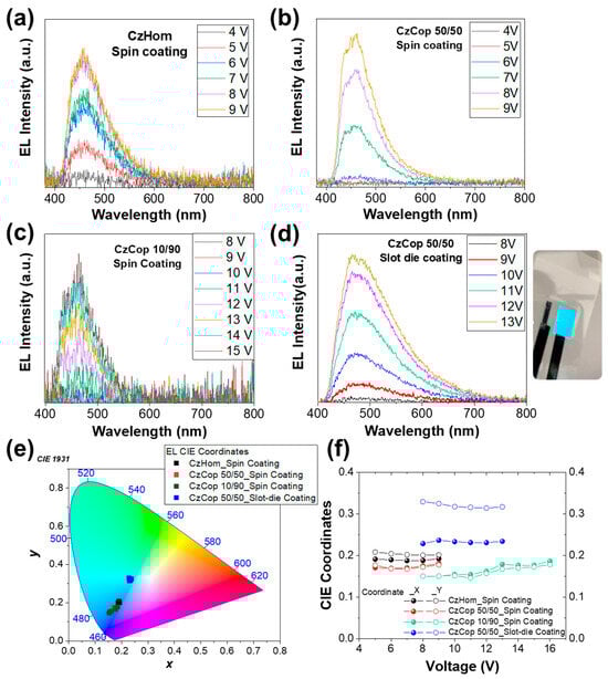 The evolution of EL emission spectra of blue-emitting devices based on Cz polymers: (a) CzHom, (b) CzCop 50/50_Spin coating, (c) CzCop 10/90_Spin coating, (d) CzCop 50/50_Slot-die coating under excitation with various bias voltages. (e) CIE coordinate diagram of the Cz-based blue PLEDs and (f) the evolution of CIE coordinates under different applied voltages. The photograph shows a CzCop 50/50 PLED printed via slot die coating onto a flexible substrate.