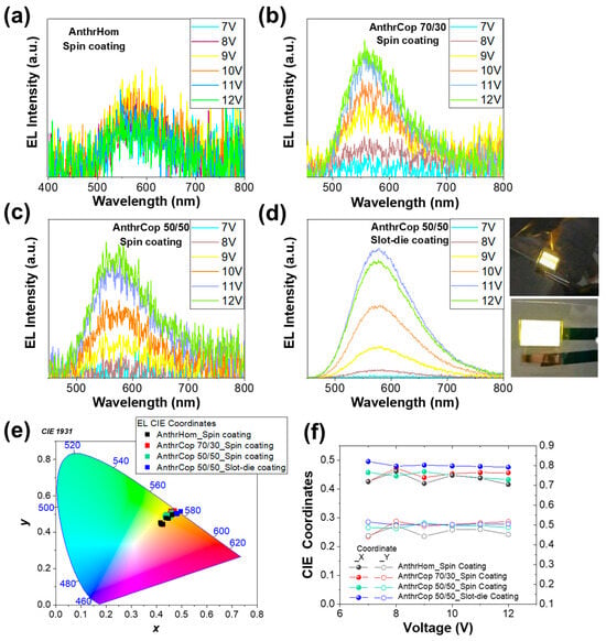 EL spectra at different applied voltages of (a) AnthrHom via spin coating, (b) AnthrCop 70/30_Spin coating, (c) AnthrCop 50/50_Spin coating, (d) AnthrCop 50/50_Slot-die coating, (e) CIE coordinate diagram of the fabricated Anthr-based PLEDs and (f) the evolution of CIE coordinates under different applied voltages of the Anthr-based PLEDs. The photographs show AnthrCop 50/50 PLEDs printed via slot die coating onto a flexible substrate.