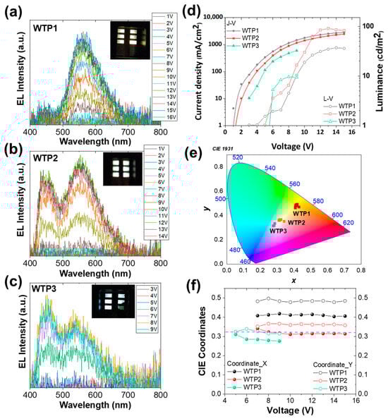 The evolution of EL emission spectra of devices based on (a) WTP1, (b) WTP2, and (c) WTP3 via spin coating under excitation with various bias voltages. (d) Characteristics curves of J–V and L–V. (e) CIE diagram of EL emission of the studied WOLED terpolymers and (f) the evolution of their EL CIE coordinates during the device operation. The insets in (a–c) show representative WPLEDs fabricated onto glass substrates via spin coating.