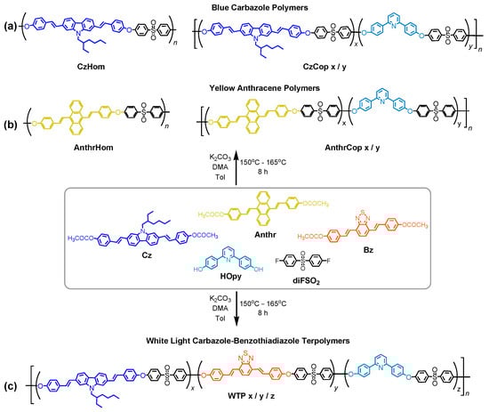 Synthetic scheme of the luminescent homopolymers (CzHom and AnthrHom), copolymers (CzCop and AnthrCop), and white light luminescent terpolymers (WTP). (a) Blue light-emitting Cz-bearing polymers, (b) yellow light-emitting Anthr-bearing polymers, and (c) white light-emitting Cz- and Bz-bearing terpolymers.
