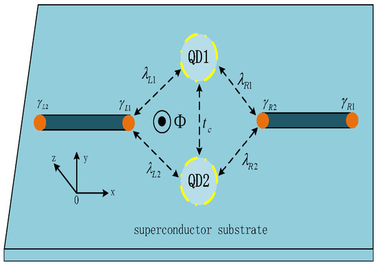 Until now, there have been two limitations in previous works on the Josephson current through MNW–QD–MNW systems: one is that only the current’s magnitude and period were studied, and less attention was paid to the control of its direction [33,34,35,36,37]; the other is that only a single QD was inserted between two MNWs, and the interesting quantum interference effect was left untouched [14,16,20,21,39,41,42,43,44,47,48]. In view of these, we propose a structure composed of parallel double QDs (DQDs) sandwiched between the left and right MNWs to achieve the JDE based on the quantum interference effect arising from the two transport paths through the DQDs, as well as the magnetic flux penetrating through the loop, which is shown in Figure 1. We emphasize that the present device can be experimentally realized by, for example, combing the two similar systems reported in Refs. [45,49,50]. In Refs. [45,50], parallel DQDs were successfully inserted between two conventional superconductors, which may be further driven into a topological superconductor state hosting MBSs [26] and then becomes the present device. In Ref. [50], serial DQDs connected to two normal leads were coupled to each other via both a superconductor hosting MBSs and a normal tunnel barrier. In some previous works, DQDs have been inserted between conventional superconductor leads to generate spin-correlated electron pairs, as well as to control the Josephson current and its critical one [41,42,44]. Our studies show that, in this MNW–DQD–MNW system, the period, magnitude, and the directions of the Josephson current can be effectively adjusted with the help of dot energy levels, overlap amplitude between the MBSs, as well as the magnetic flux through the loop. Accordingly, a tunable JDE with a large value of diode efficiency emerges, and it may find real use in the design of superconductor-based instruments.