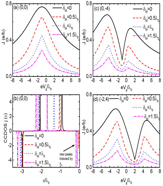 If the energy levels in the two QDs are different from each other , there are two current peaks corresponding to the two molecular states in the DQDs, as shown in Figure 2c,d, in which were set as (0, −4) and (−2, 4), respectively. The height of the current peak at bonding state was lower than that at the antibonding state . When the MBSs in the same MNWs were overlapped (), the current peaks shown in Figure 2c,d were lowered and narrowed as in the case of Figure 2a. Moreover, the positions of the peaks were slightly changed by for the cases of , which is different from the that of . It should be noted that the reduction in the Josephson current peaks in Figure 2c,d was mainly induced by the charge flowing through the two molecular states . This is different from the case in Figure 2a, where the charge flows only through the bonding state . This means that electrons will transport through the DQDs whenever their energy is in resonance with the bonding and antibonding states, even if or is away from the Fermi level.