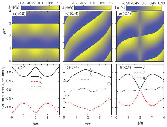 Josephson current J as a function of and , the positive (negative) critical current , the diode efficiency as functions of for the configurations of (0, 0) in (a) and (b), the (0, −4) in (c) and (d), and the (−2, 4) in (e) and (f) for , respectively. Other parameters are and .