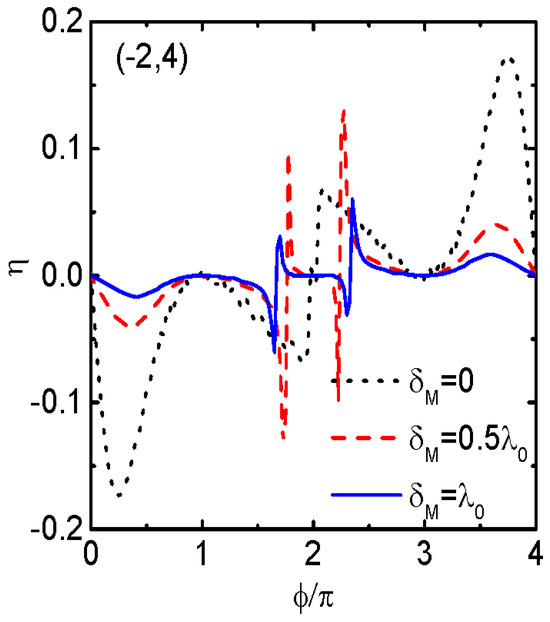 In Figure 4, we present the impacts of the MBS–MBS overlap amplitude on the diode efficiency with fixed QD-energy-level configurations . From the figure, one can see that the diode efficiency remained as a periodic function of in the presence of finite , and it is anti-symmetrical with respect to . With increasing , the peaks’ heights around were lowered with almost unchanged locations. The double-peak configuration around in the case of , however, evolved into a triple-peak one for , as is indicated by the red dashed and blue dotted lines. Moreover, the two pairs of peaks, which were shifted individually to magnetic flux values that were greater and smaller than , kept the same shape as those of , i.e., one positive and one negative. The heights of the two pairs of the peaks changed nonlinearly with respect to . For the chosen values of , the maximum of first increased (by comparing the black dotted line for with the red dashed line for ) and then decreased (the blue solid line for ). The results displayed in Figure 4 indicate that by properly adjusting the value of , one can change either the amplitude or the sign of the diode efficiency. In the experiments, depended on the lengths of the MNWs and the superconductor coherence [25,26], which can all be used for changing the JDE.