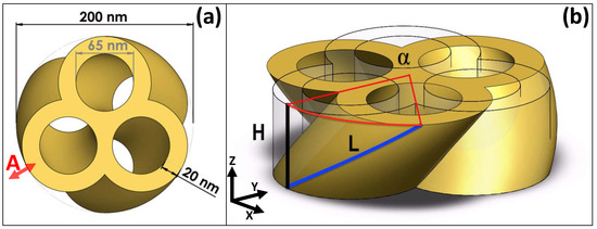 The geometry of the TnP used in this study is based on a three-lobed structure of identical rings, with an inner diameter of 65 nm and a wall thickness of 20 nm, as presented in Figure 1. The centers of the rings are disposed in the vertices of an equilateral triangle; as a result, the whole structure is circumscribed in a circle with a radius of 100 nm. The twisted TnP is subsequently obtained by vertically sweeping this geometry along a helical path (L) with a varying . That sweep, together with the vertical dimension (H = 60 nm), defines the pitch of the propeller (). TnP is a singularly connected structure and having a topological genus of 3.