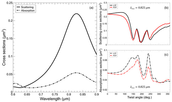 (a) Scattering and absorption cross-section for the untwisted TnP in Figure 1 for LCP and RCP (no differences for this geometry), clearly depicting the main plasmonic resonance at m and another weaker one at shorter m wavelength. (b) Scattering and (c) absorption cross-sections for a fixed wavelength, , varying the twisting angle.
