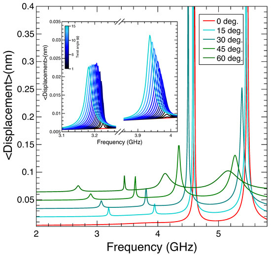 In order to find the resonant modes corresponding to the structure, we monitor the average displacement (i.e., the 3D integral of the RMS displacement of each point of the TnP normalized to its volume). The resonant modes appear as distinct peaks, as presented in Figure 4. Two natural, low-frequency, modes for an untwisted (red curve) TnP appear at 4.6 GHz and 5.5 GHz, respectively, and correspond to the breathing modes with maximum (low-frequency) and minimum (high-frequency) displacement at the point marked A in Figure 1. As soon as the structure is slightly twisted (even by just one degree), we clearly observe two different phenomena. The first one is that the resonances associated with the breathing modes shift towards lower energies (i.e., the wavelength associated with the resonances increases), in perfect correspondence with the previously presented optical behavior. The second observation, now at variance with the optical case, is that, in the 3 to 4 GHz region, two new resonances appear, which downshift in frequency as the twist angle increases. For a zero twist angle (red curve in Figure 4 and its inset), there are no resonances in this region, but even for a twist of one degree, they appear (black curve in Figure 4’s inset). The evolution with a twist angle from = 0 to = 15 deg. (see the inset in Figure 4) shows a further increase in intensity and a downshifting in frequency. In Figure A2 in Appendix B, we present some snap shots for the breathing modes at deg. and for low-frequency twist-enabled modes at deg.