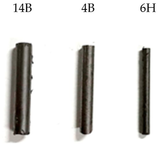 Three distinct grades of pencil leads, i.e., 6H, 4B, and 14B, were carefully selected for this experiment, as shown in Figure 1. The 6H (lightest) lead, measuring 2 mm in diameter, contained minimal graphite content. The 4B (medium) lead, with a 3 mm diameter, had moderate graphite content, while the 14B (darkest) lead, 4 mm in diameter, possessed a rich graphite composition.
